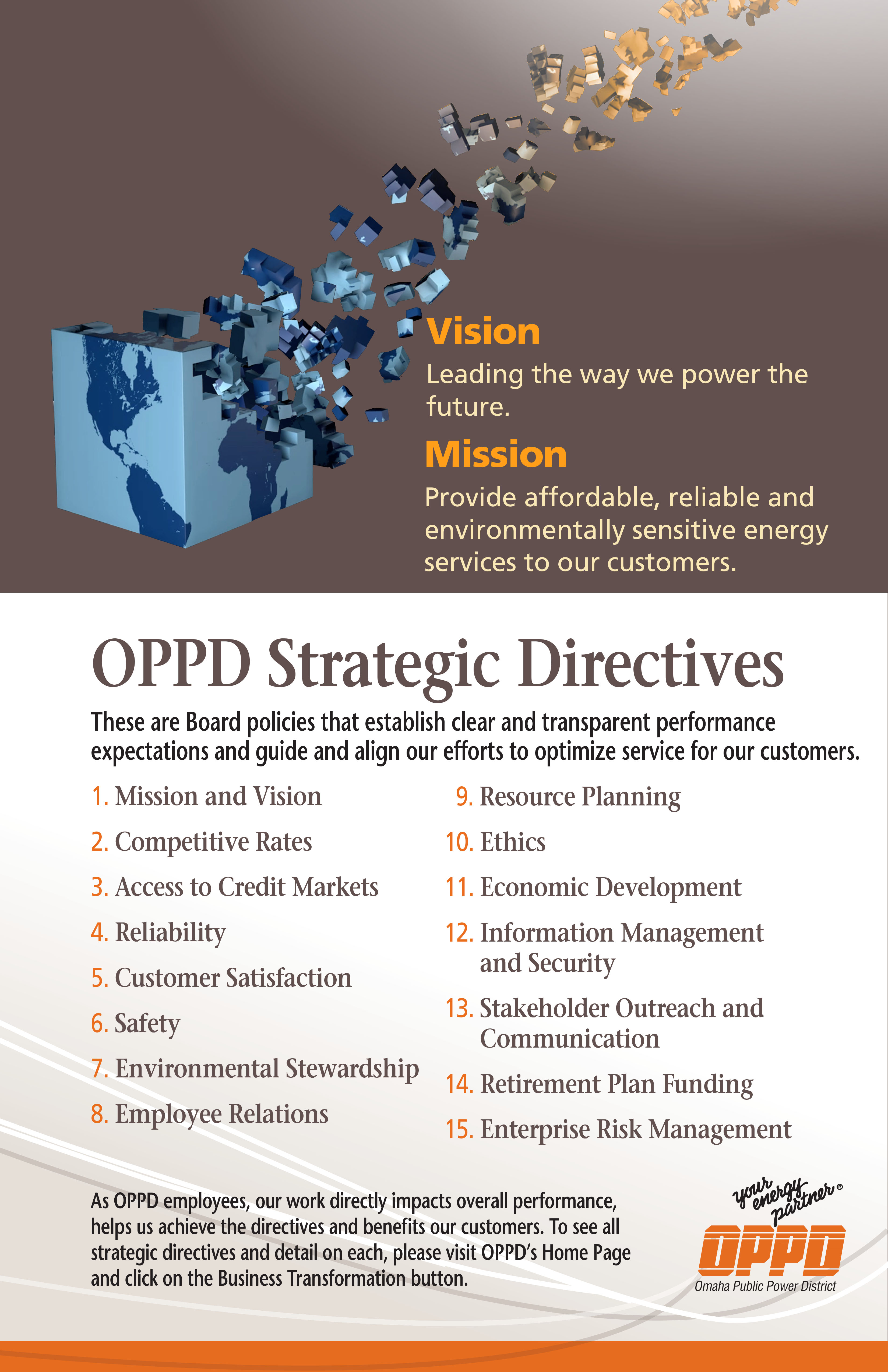 OPPD is governed by a senior management team and elected board of directors. Find information about the senior leaders and board of director meetings.